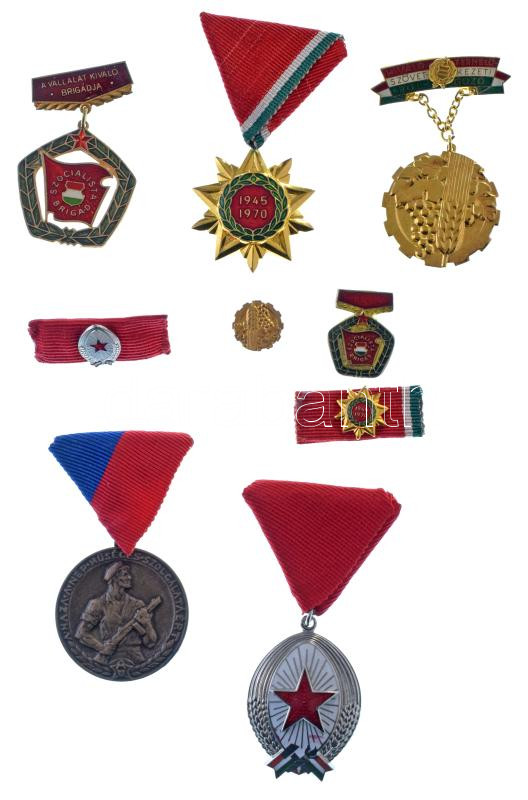 Vegyes 5db-os kitüntetés tétel, benne: 1960-1980 k. "A Vállalat Kiváló Brigádja - Szocialista Brigád" aranyozott, műgyantás jelvény miniatűrrel; 1964. "Munkásőr Emlékérem" bronz kitüntetés mellszalagon; 1970. "Felszabadulási Jubileumi Emlékérem" aranyozott, műgyantás bronz kitüntetés mellszalagon, miniatűrrel szalagsávon; 1970 k. "Kiváló Termelőszövetkezeti Dolgozó" aranyozott, műgyantás kitüntető jelvény hiányos miniatűrrel; 1985. "A Munka Érdemrend ezüst fokozata" zománcozott, ezüstözött bronz kitüntetés eredeti mellszalagon, miniatűrrel szalagsávon T:AU,XF