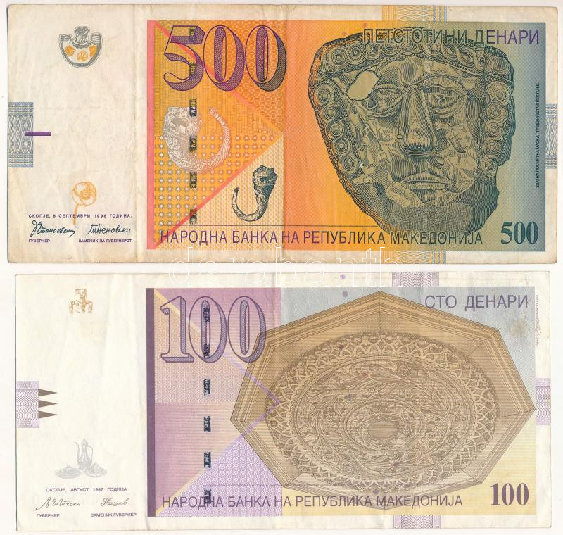 North Macedonia 1996. 500... https://www.darabanth.com/hu/517-Filatelia-kepeslap-numizmatika-mutargy-konyv-papirregiseg-ekszer-aukcio/522.0/Numizmatika/Kulfoldi-bankjegyek~481/Eszak-Macedonia-1996-500D-plus-1997-100D-T-FNorth-Macedonia-1996-500-Denari-plus-1997-100-Denari~II3511778