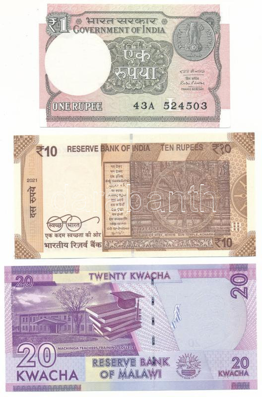India 2016. 1 Rupee + 2021. 10 Rupees + Malawi 2020. 20 Kwacha C:UNC-AU