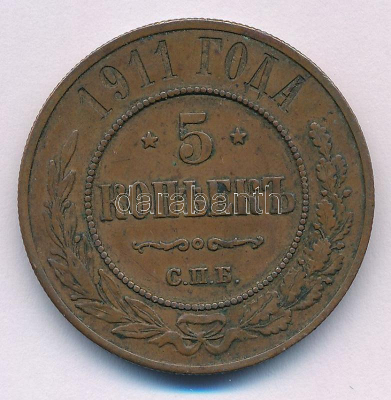 Russian Empire 1911. 5 Kopecks Cu C:... https://www.darabanth.com/hu/517-Filatelia-kepeslap-numizmatika-mutargy-konyv-papirregiseg-ekszer-aukcio/522.0/Numizmatika/Kulfoldi-fem-es-ezustpenzek~482/Orosz-Birodalom-1911-5k-Cu-T-XFRussian-Empire-1911-5-Kopecks-Cu-C-XF~II3510224