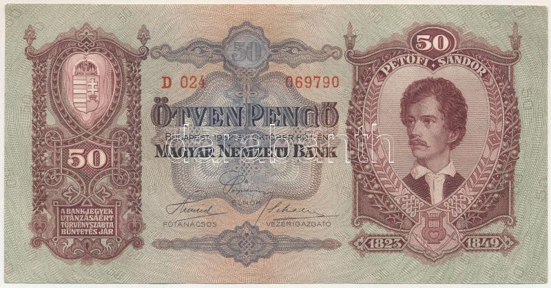 1932. 50P "D 024 069790" T:F szép papír https://www.darabanth.com/hu/517-Filatelia-kepeslap-numizmatika-mutargy-konyv-papirregiseg-ekszer-aukcio/522.0/Numizmatika/Magyar-bankjegyek~474/1932-50P-D-024-069790-T-F-szep-papir~II3511780