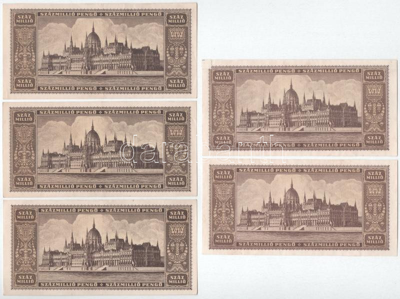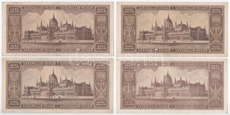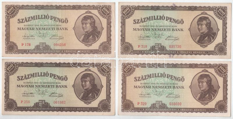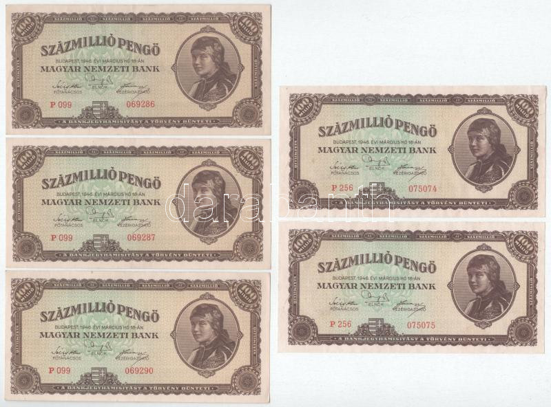 Leírás: 1946. 100.000.000P (9x) közte két sorszámkövető pár és egy közeli sorszámú "P 256 075074 - P 256 075075" + "P 099 069286 - P 099 069287" + "P 099 069290" T:XF-F szép papír