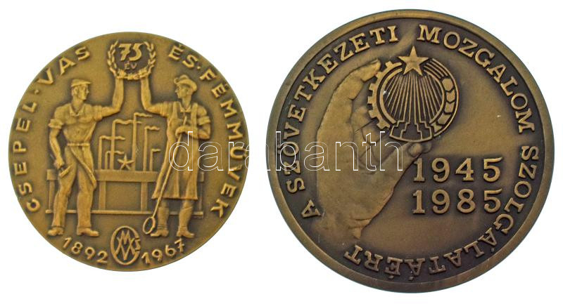 1967. "Csepel Vas- és Fémművek 75 év 1892-1967" egyoldalas bronz emlékérem (60mm) + 1985. "A Szövetkezeti Mozgalom Szolgálatáért 1945-1985 / Felszabadulásunk 40. évfordulójára" kétoldalas bronz emlékérem (70mm) T:AU