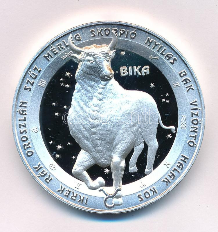 Kósa István (1953-) DN "Bika" egyoldalas ezüstözött fém horoszkóp emlékérem sérült kapszulában (42,5mm) T:PP kis patina