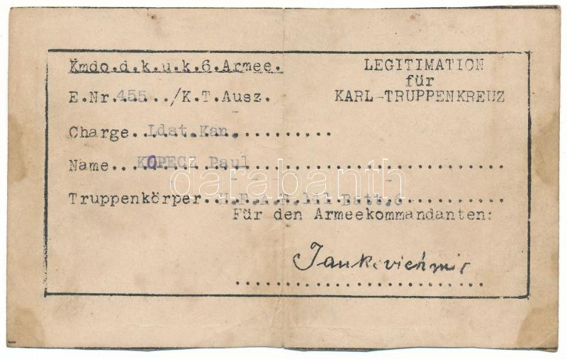 1916-1918. Névre szóló, kitöltött viselői igazolvány a "Károly-csapatk... https://www.darabanth.com/hu/517-Filatelia-kepeslap-numizmatika-mutargy-konyv-papirregiseg-ekszer-aukcio/522.0/Numizmatika/Militaria~486/1916-1918-Nevre-szolo-kitoltott-viseloi-igazolvany-a-Karoly-csapatkereszthez-T-VGHungary~II3507513