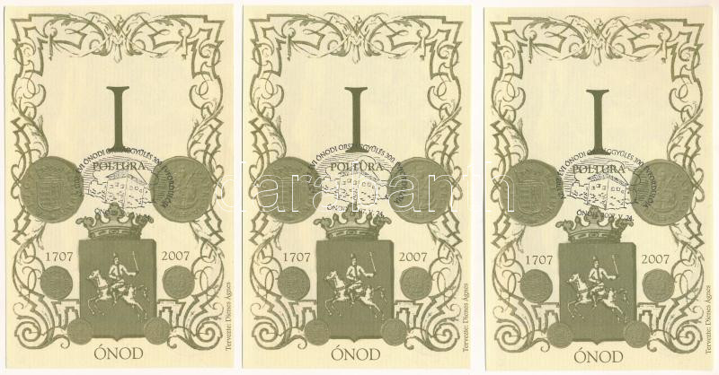 2007. Ónod I Poltura (3db) mind sorszám nélkül, mindegyik előlapján "Az 1707. évi ónodi országgyűlés 300. évfordulója" felülbélyegzéssel, mindegyik hátlapján "Ónod Község Önkormányzata" felülbélyegzéssel T:UNC,AU
