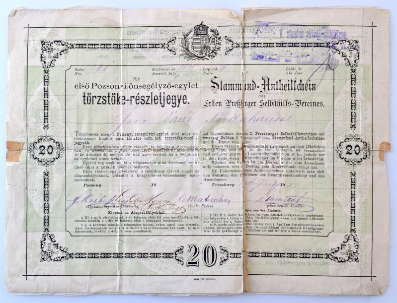 Pozsony 1877. "első Pozsonyi önsegélyező-egylet törzstőke-részletjegye... https://www.darabanth.com/hu/517-Filatelia-kepeslap-numizmatika-mutargy-konyv-papirregiseg-ekszer-aukcio/522.0/Numizmatika/Reszvenyek-es-sorsjegyek~472/Pozsony-1877-elso-Pozsonyi-onsegelyezo-egylet-torzstoke-reszletjegye-20-osztrak-erteku~II3511655