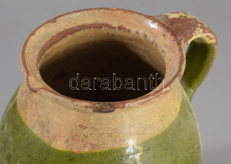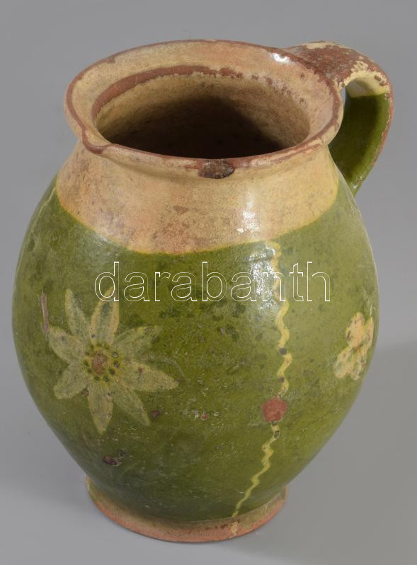 Leírás: Köcsög. Mázas cserép, XIX. sz. kézzel festett, sérüléssel. 20 cm