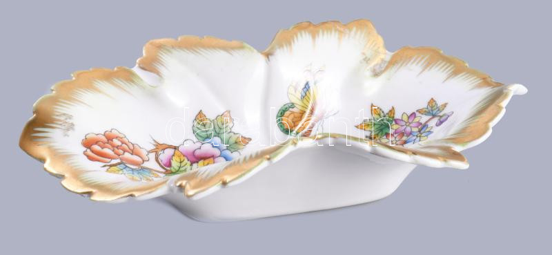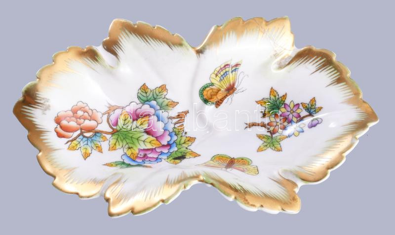 Leírás: Herendi Viktória mintás levél alakú tálka. Jelzett, restaurált, h: 15,5 cm