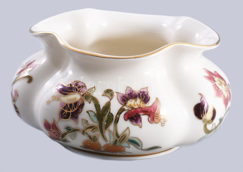 Leírás: Zsolnay aranykontúrozott virágmintával díszített paradicsomvirág váza, jelzett, hibátlan, d: 13 cm