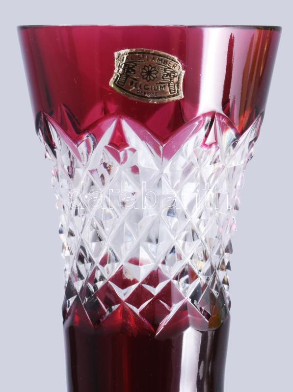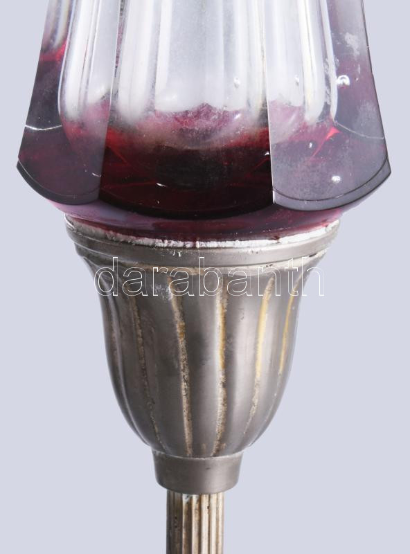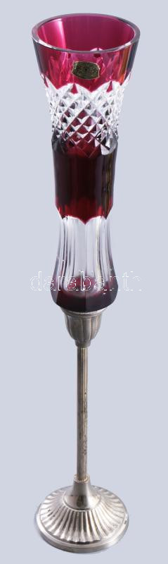 Leírás: Val St. Lambert pácolt kristály váza, nagyméretű ezüstözött talpon, címkével jelzett, kis kopással, m: 41 cm
