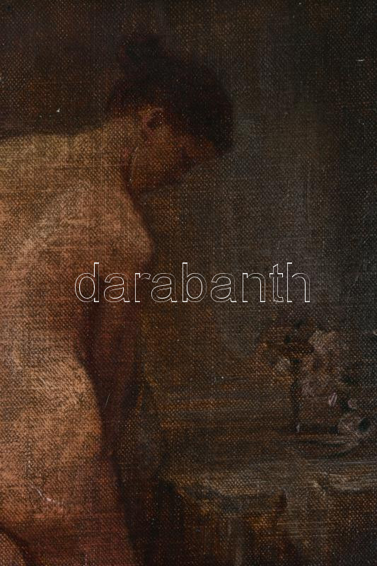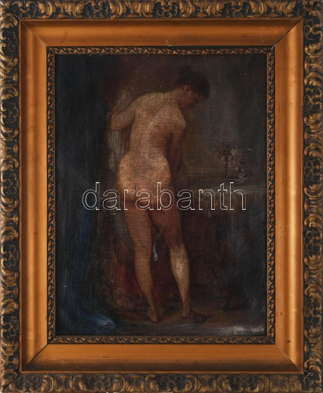 Leírás: Jelzés nélkül: Álló női akt. Olaj, vászon, kartonon. Kissé sérült. Dekoratív, kissé sérült fakeretben. 40x30 cm