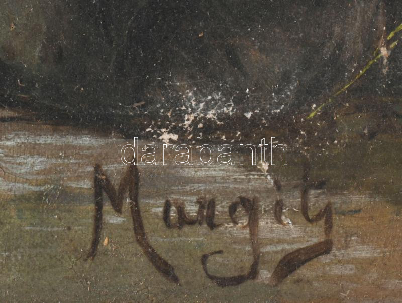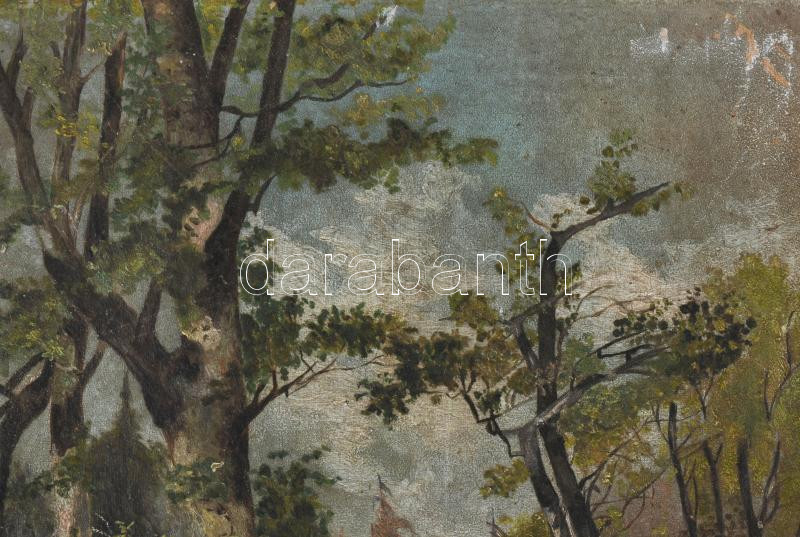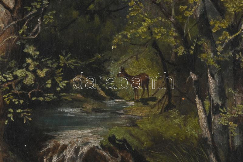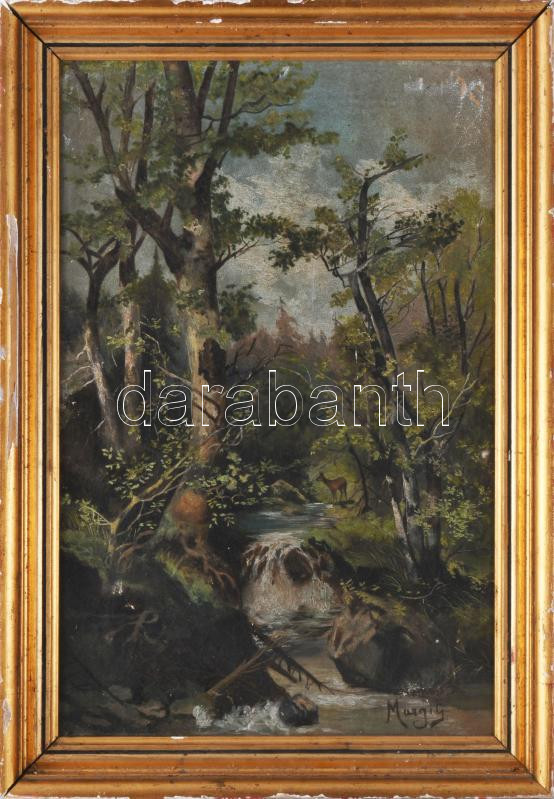 Leírás: Margit jelzéssel, XIX. sz. vége/XX. sz eleje: Vad az erdőben. Olaj, vászon. Apró felületi sérülésekkel. Dekoratív, sérült fakeretben, 48×31,5 cm