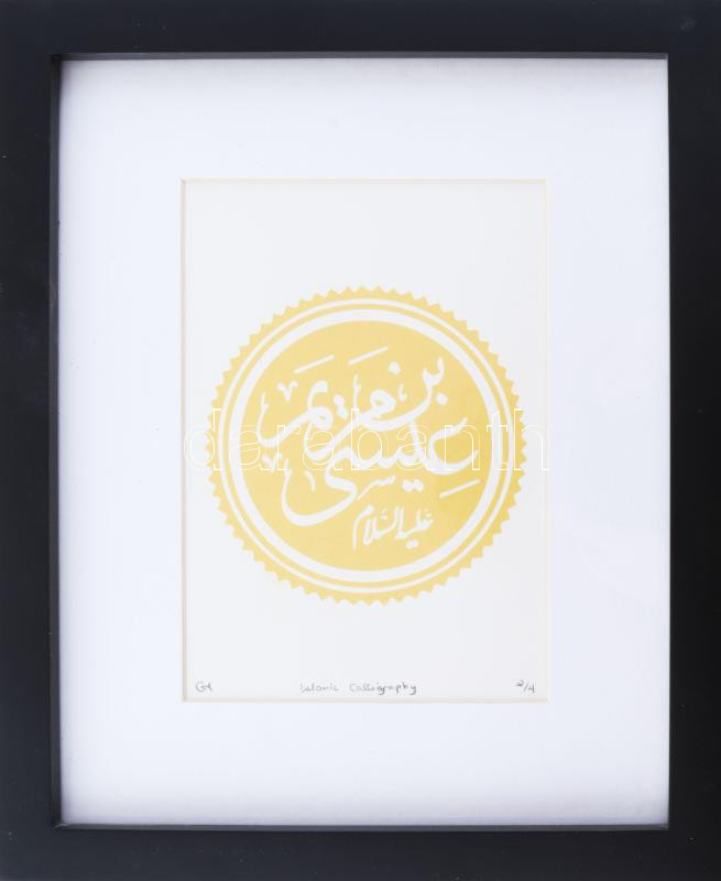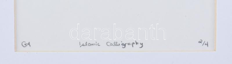 Leírás: Olvashatatlan jelzéssel: Iszlám kalligráfia. Szitanyomat, papír. Számozott (2/4). Üvegezett keretben. 16,5x11,5 cm