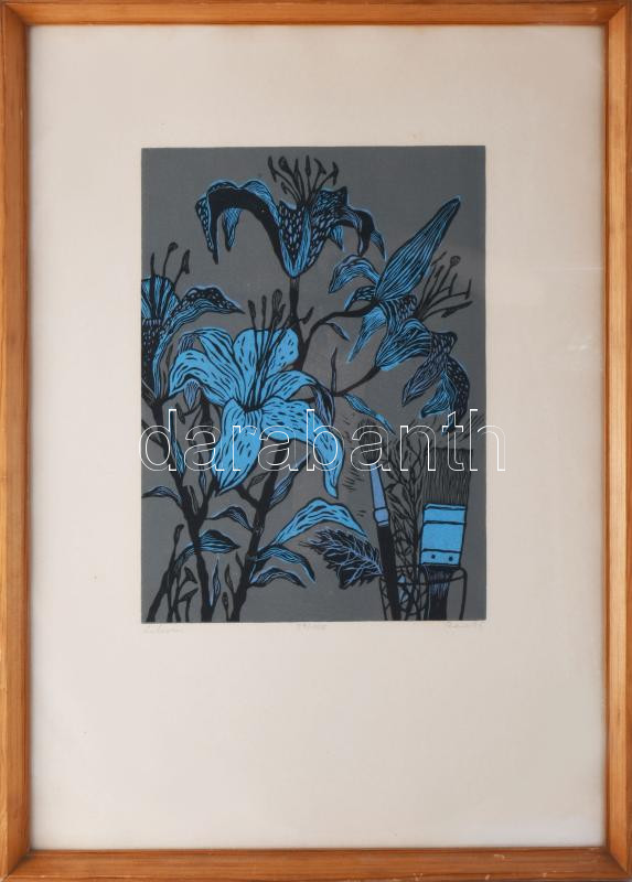 Leírás: Reich Gábor (1951-): Liliom. Linómetszet, papír, jelzett, számozott (59/100), üvegezett fakeretben, 34×25 cm