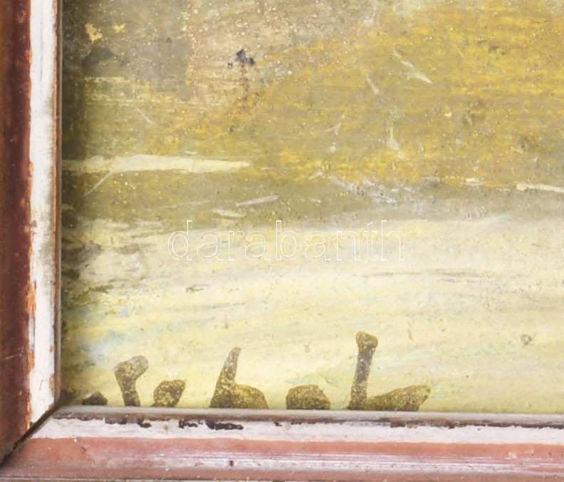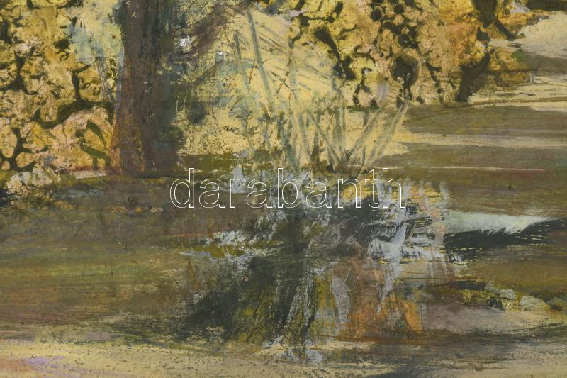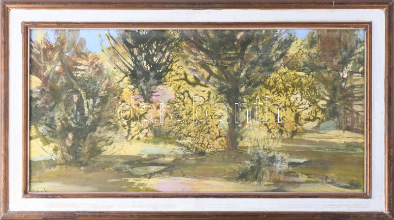 Leírás: Scholz Erik (1926-1995): Erdő szélén. Olaj, farost, jelezve balra lent, hátoldalán Szőnyi István Alkotóközösség címkéjével, fakeretben, 30×60 cm
