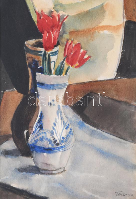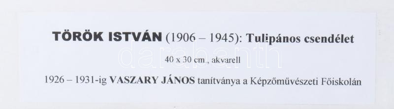 Leírás: Török István (1906-1945), Vaszary János tanítványa a Képzőművészeti Főiskolán: Tulipános csendélet, 1934. Akvarell, papír, jelzett. Üvegezett fakeretben, 38×28 cm