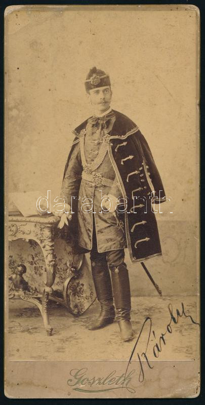 Leírás: 1895 Dr. Szladics Károly (1871-1956) jogász, egyetemi tanár, MTA tag doktorrá avatásakor, keményhátú fotó Goszleth István budapesti műterméből, felületén törésnyom, 20,5×10,5 cm
