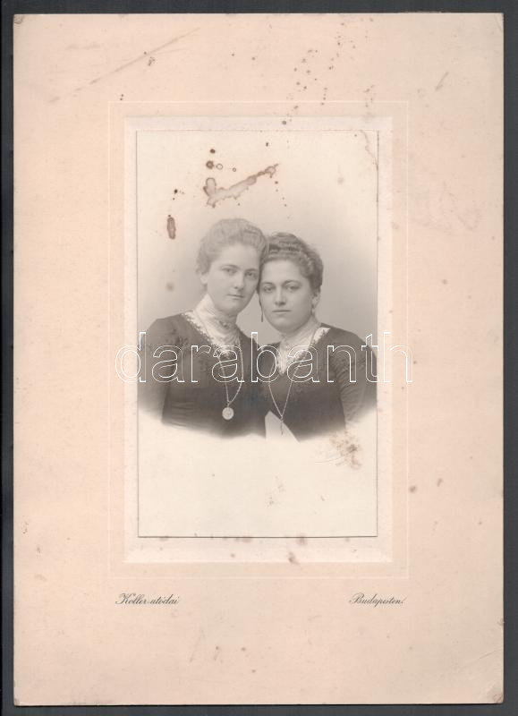 Leírás: 1900 Két elegáns öltözetű hölgy portréja, kartonra kasírozott fotó Koller Károly utódai budapesti műterméből, dekoratív verzóval, foltos, 18,5x11 cm, karton: 31x22 cm