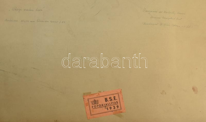 Leírás: 1939 Tarjánné Dvihally Anna (1907-1982): "Régi zalai ház", fotó kartonon, "B. S. E. Fotokiállítás 1939" címkével, a hátoldalon feliratozva, foltos, kopott kartonnal, 22x29 cm, karton: 42x47 cm