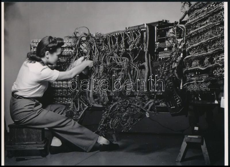 Leírás: 1958 Berenice Abbott (1898-1991) amerikai fotográfus felvétele egy hölgyről, aki nem egy tyúkot belezett ki a vasárnapi ebédhez, hanem egy IBM könyvelőgép zúzáját keresi, 1 db modern nagyítás, jelzés nélkül, 15x21 cm