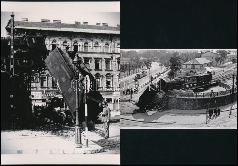 Leírás: Budapest, Déli pályaudvar, a mozdonyfordítónál túlgurult szerelvény balesete, két nézőpontból, 2 db modern nagyítás, jelzés nélkül, 21x15 cm és 10x15 cm