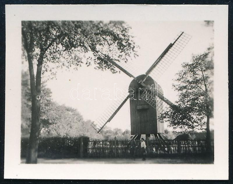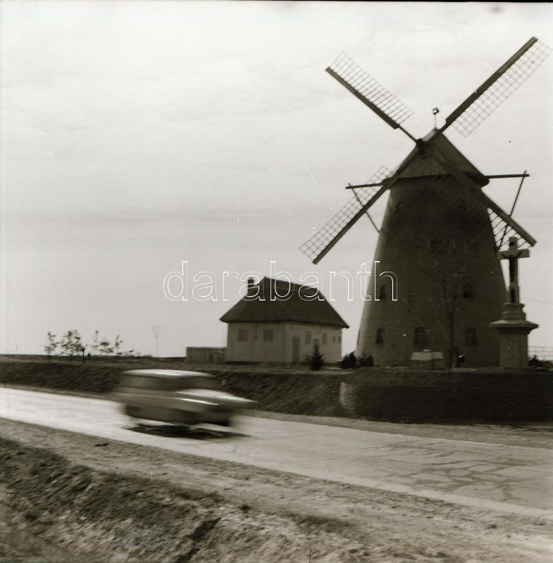 Leírás: Szélmalmok, 1 db vintage negatív (6x6 cm) a kecskeméten felépített, rekonstruált szélmalomról (cca 1976), + 1 db vintage fotó, amely a hátoldalán feliratozott helyen készült, cca 1920-as években, 3,6x4,6 cm / windmills