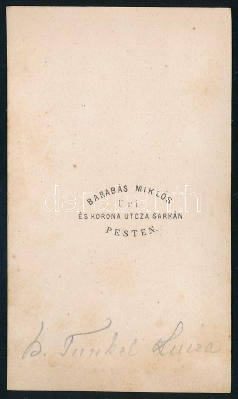 Leírás: cca 1865 báró Tunkel Lujza (szül. Culmann Lujza), asprungi és hohenstadti báró Tunkel Adolf (1822-1883) feleségének portréja, vizitkártya Barabás Miklós pesti műterméből, a hátoldalon feliratozva, 10,5x6 cm