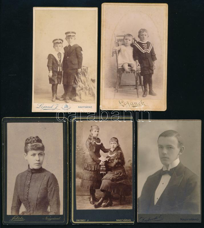 Leírás: cca 1880-1910 5 db vizitkártya különféle nagyváradi műtermekből (Lojanek János, Fekete Sándor, Decsey I., Dajkovits E.), változó állapotban, 10,5x6,5 cm körül