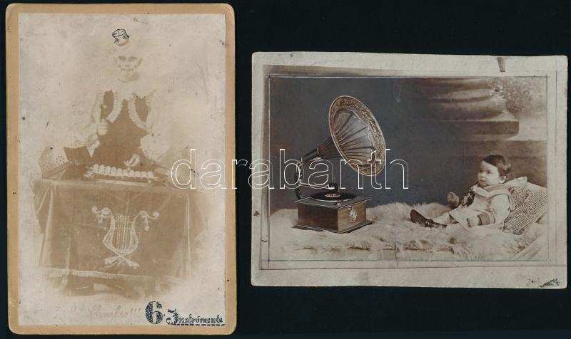 Leírás: cca 1910 Bohóc, aki hat hangszeren játszik (Music Clown), a ?Charles? (=Károly), Musik Clown, aki a fényképen felsorolt 6 hangszeren játszik, maga Wágner A. Károly és kisgyerek gramofonnal, 2 db keményhátú fotó, 16,5×10,5 cm
