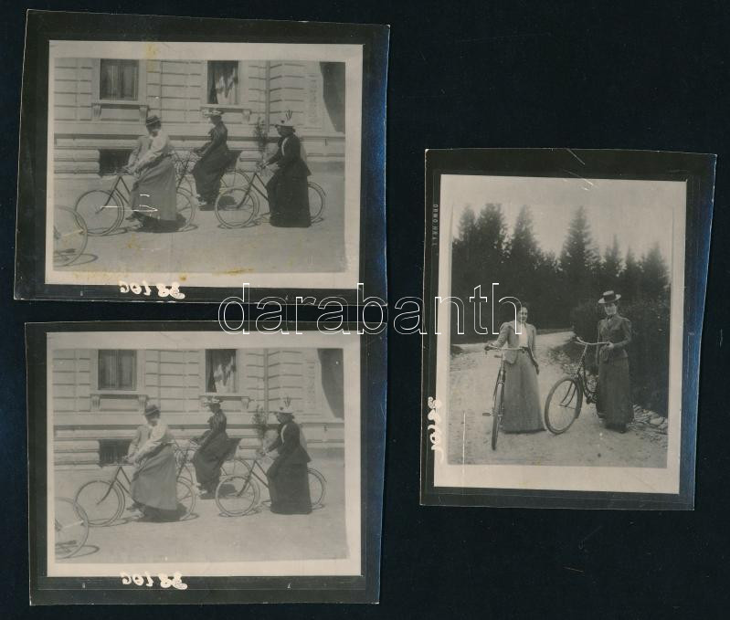 Leírás: cca 1910 Hölgyek kerékpárral, eredeti negatívról készült későbbi kontakt másolatok, 3 db, 6,5×8 cm
