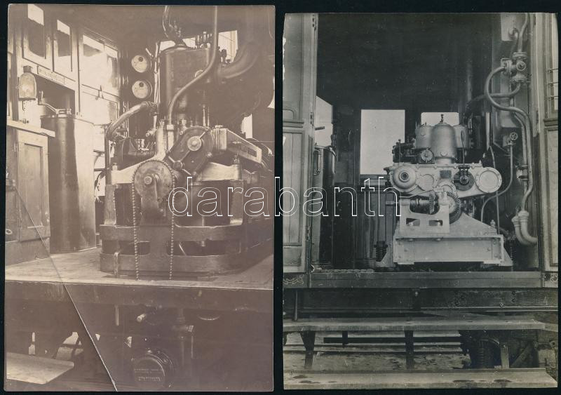 Leírás: cca 1910 Vasúti járművek gépszerkezetei, 2 db fotó, felületén törésnyomok, 11×8 cm