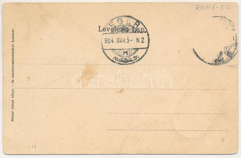 Leírás: 1904 Szatmárnémeti, Satu Mare; Látkép. Szecessziós címeres litho lóherével. Reizer János kiadása / view. Art Nouveau, coat of arms litho with clovers (szakadás / tear)