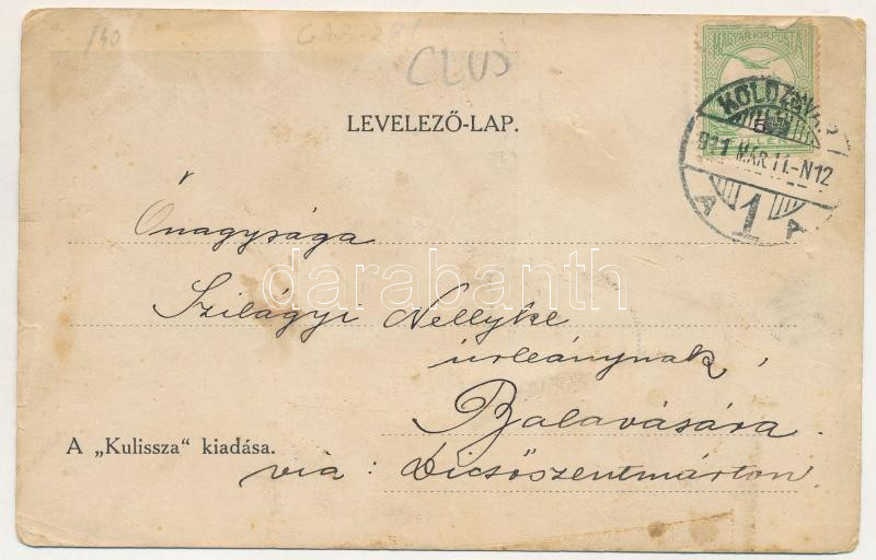 Leírás: 1911 Kolozsvár, Cluj; Báthory Elza (1883-1976) színésznő, 1910 őszétől 1918-ig a kolozsvári Nemzeti Színház tagja. A "Kulissza" kiadása / Elza Báthory actress. Member of the National Theatre of Cluj from 1910 to 1918 (EM)