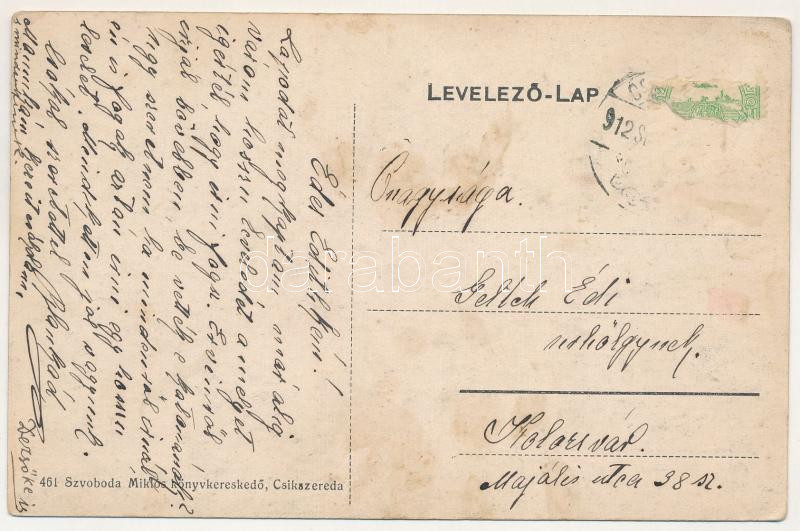 Leírás: 1912 Csíkszereda, Miercurea Ciuc; Rákóczi utca, patika, gyógyszertár, divatáruház, Ligeti Samuné, Szvoboda Miklós üzlete és saját kiadása / street view, pharmacy, fashion store, publisher's shop (fl)