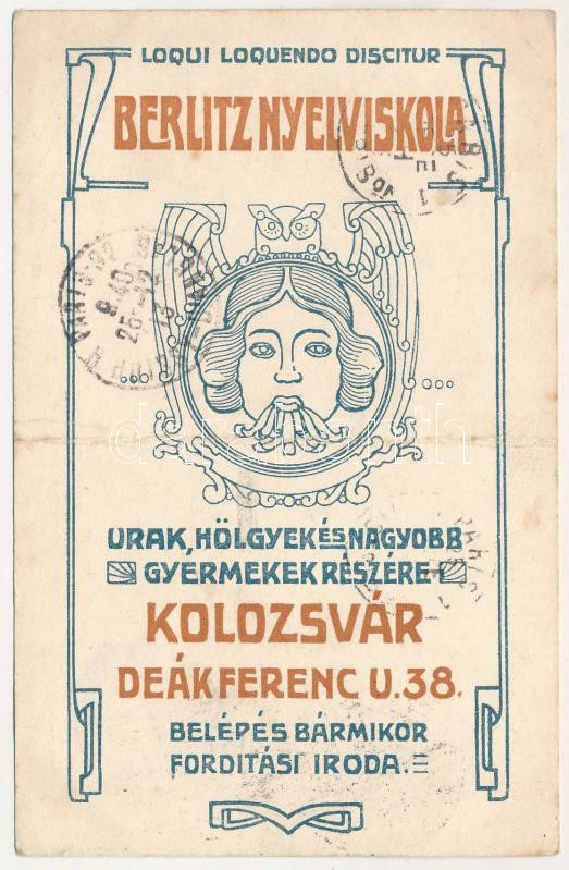 1913 Kolozsvár, Cluj; Berlitz nyelviskola szecessziós reklámlapja. Deá... https://www.darabanth.com/hu/518-Filatelia-kepeslap-numizmatika-mutargy-konyv-papirregiseg-ekszer-aukcio/524.0/Kepeslapok/Erdely~743/1913-Kolozsvar-Cluj-Berlitz-nyelviskola-szecesszios-reklamlapja-Deak-Ferenc-utca-38-Berlitz~II3521120