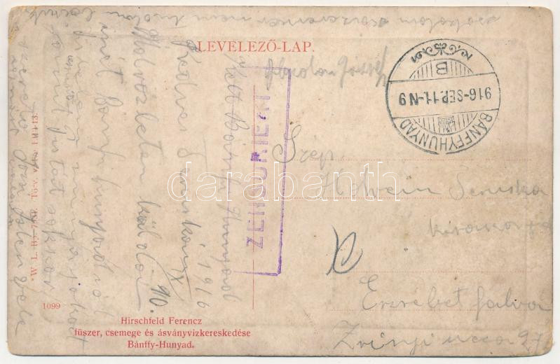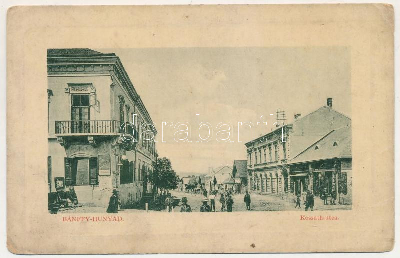 Leírás: 1916 Bánffyhunyad, Huedin; Kossuth utca, Tigris szálloda, kávéház és étterem, takarékpénztár. W.L. Bp. 7084. Hirschfeld Ferenc kiadása / street view, hotel, café and restaurant, savings bank (EM)