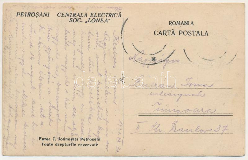 1931 Petrozsény, Petrosani; Centrala Electrica Soc. "Lonea" / Lónya vi... https://www.darabanth.com/hu/518-Filatelia-kepeslap-numizmatika-mutargy-konyv-papirregiseg-ekszer-aukcio/524.0/Kepeslapok/Erdely~743/1931-Petrozseny-Petrosani-Centrala-Electrica-Soc-Lonea-Lonya-villanytelep-electric-power~II3519592
