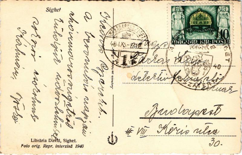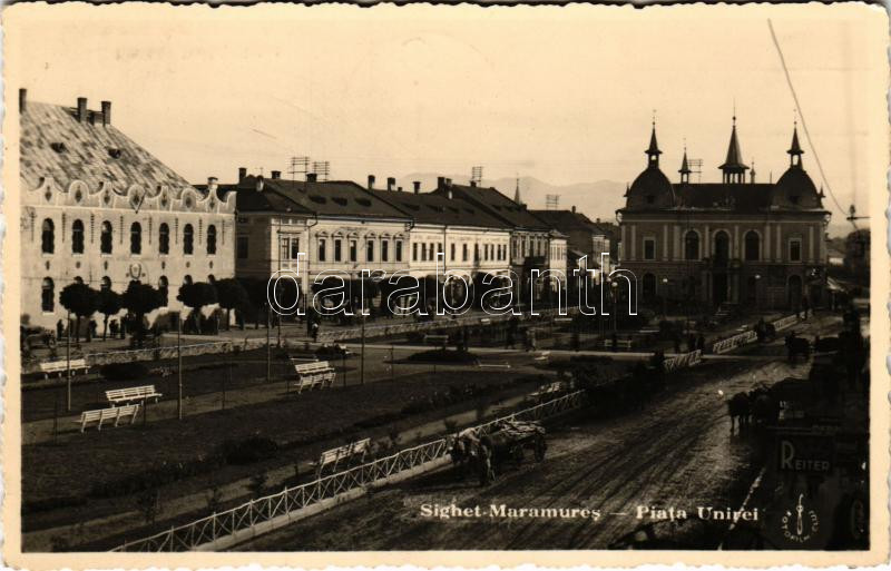 Leírás: 1940 Máramarossziget, Sighetu Marmatiei; Piata Unirei / Egyesülés tér, üzletek, piac, Reiter / square, shops, market + "1940 Máramarossziget visszatért" So. Stpl. (fa)