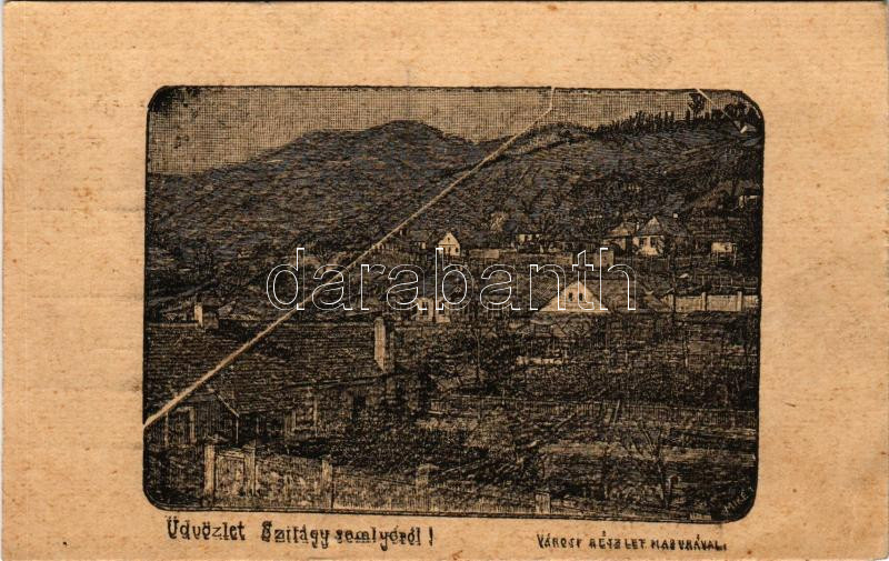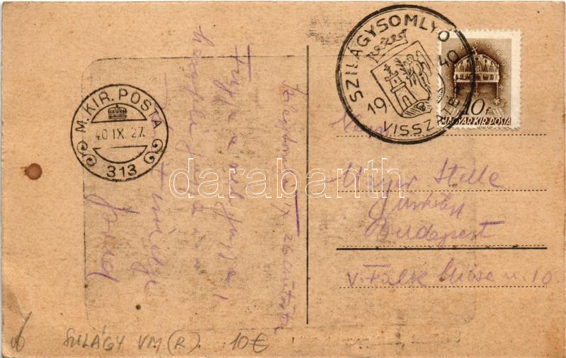 Leírás: 1940 Szilágysomlyó, Simleu Silvaniei; Városi részlet a Magurával / general view, art postcard s: Mike + "M. KIR. POSTA 313" + "1940 Szilágysomlyó visszatért" So. Stpl. (vágott / cut)