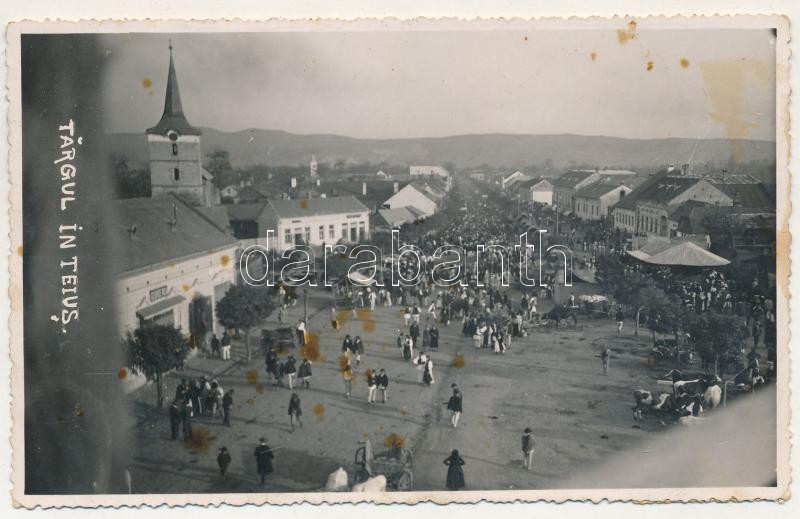 Leírás: 1940 Tövis, Teius; Targul / piac, George Risa üzlete, templom / market, shops, church. photo (fl)