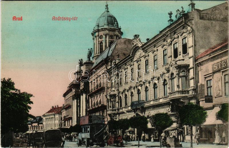 Leírás: Arad, Andrássy tér, Steigerwald A. bútorgyáros, Morgenstern Gyula, Hegedűs Gyula, Gellér I. üzlete, autóbusz / square, shops, autobus
