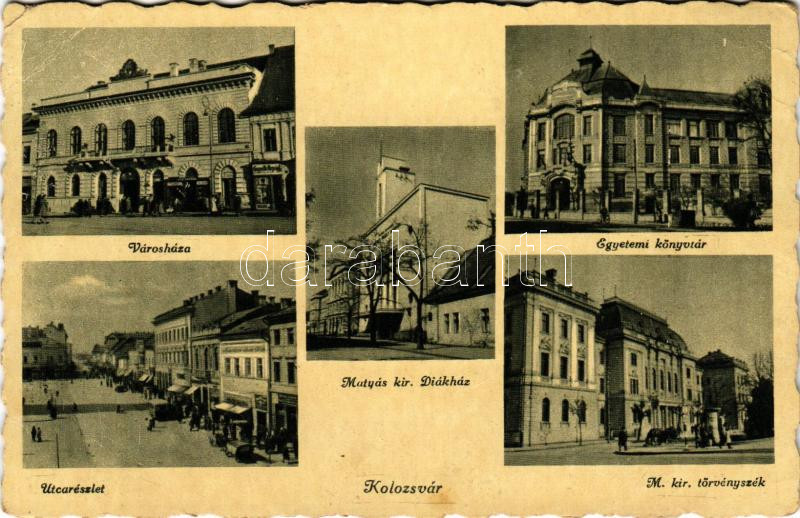 Leírás: Kolozsvár, Cluj; Városháza, utcarészlet, Mátyás király szülőháza, egyetemi könyvtár, M. kir. törvényszék / town hall, street view, birthplace of Kin Matthias, university library, court (EB)