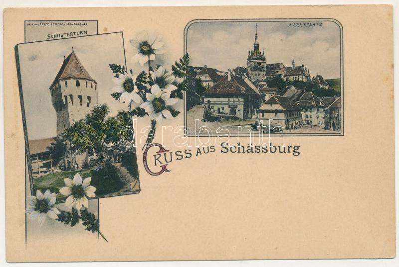 Leírás: Segesvár, Schässburg, Sighisoara; Schusterturm, Marktplatz / Cipészek bástyája, Piactér, üzlet. Fritz Teutsch kiadása, szecessziós-virágos keret / tower, market square, shops. Art Nouveau, floral frame (kis szakadás / small tear)