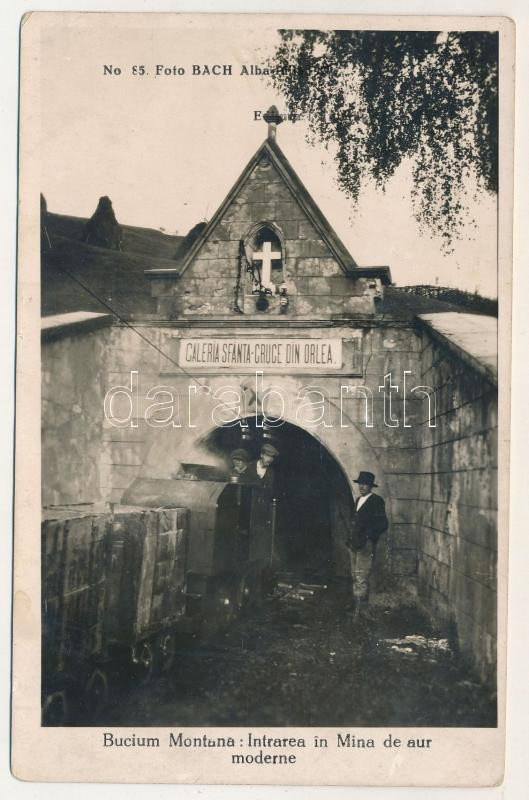 Leírás: Verespatak, Goldbach, Rosia Montana; Bucium Montana, Intrarea in Mina de aur moderne. Galeria Sfanta Cruce din Orlea / aranybánya, iparvasút, bányavasút, gőzmozdony, vonat / gold mine, industrial railway, locomotive, train. Foto Bach (Alba Iulia) 1929. (fl)