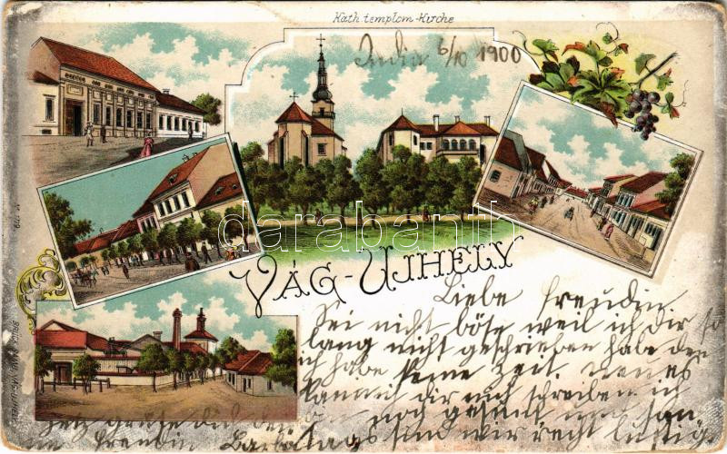 Leírás: 1900 Vágújhely, Neustadt an der Waag, Nové Mesto nad Váhom; Római katolikus templom, részletek. Brück Samu kiadása / church, streets. Art Nouveau, floral, litho (kopott sarkak / worn corners)