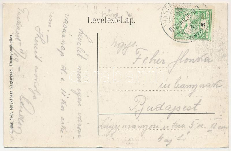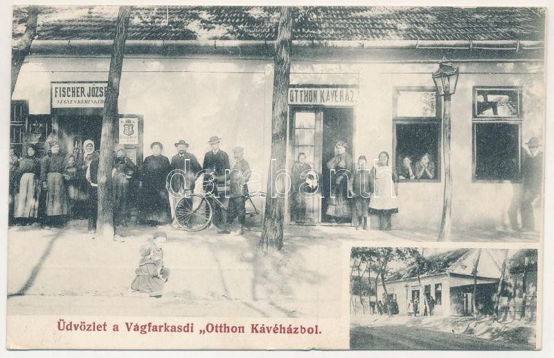 Leírás: 1912 Vágfarkasd, Farkasd, Forcas, Vlkad nad Váhom, Vlcany; Otthon kávéház, Fischer József üzlete, férfi kerékpárral. Ungár Mór fényképész / café, shop of Fischer, man with bicycle (apró szakadás / tiny tear)