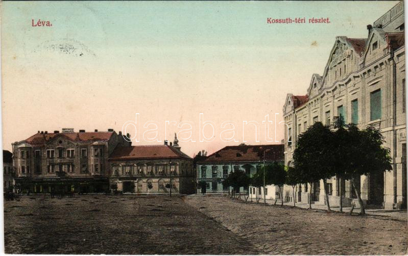 Leírás: 1915 Léva, Levice; Kossuth tér, Knapp Dávid, Bercsényi Gyula üzlete, gyógyszertár, Lévai Kereskedelmi Bank r.-t., Nagy Artúr fényképész műterme. Dukesz Lipót kiadása / square, shops, pharmacy, bank, photographer's atelier (fl)