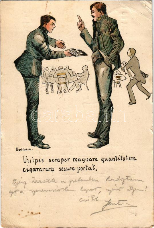 Leírás: 1927 Selmecbánya, Schemnitz, Banská Stiavnica; Vulpes semper magnam quantitatem cigarrarum secum portat. A Selmeci Diákéletből VI. Studentika. Röttig-Romwalter nyomda rt. Sopron / Studentica art postcard s: Bartha L. (lyuk / pinhole)