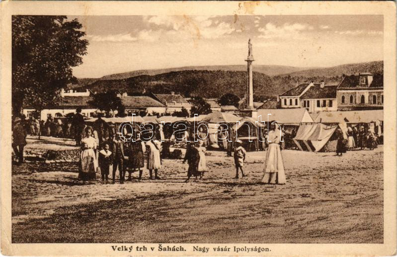 Leírás: 1938 Ipolyság, Sahy; Nagy vásár, piac / market + "1938 Az Első Visszatért Magyar Város Ipolyság" So. Stpl. (EB)